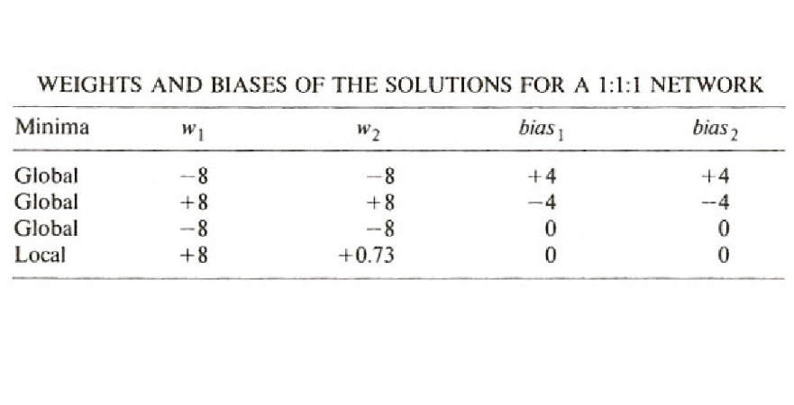 Part of the study of backpropagation networks and learning involves a study of how frequently and under what conditions local minima occur. In networks with many hidden units, local minima seem quite rare. However with few hidden units, local minima can occur. The simple 1:1:1 network shown in Figure 5.9 can be used to demonstate this phenomenon. The problem posed to this network is to copy the value of the input unit to the output unit. There are two basic ways in which the network can solve the problem. It can have positive biases on the hidden unit and on the output unit and large negative connections from the input unit to the hidden unit and from the hidden unit to the output unit, or it can have large negative biases on the two units and large positive weights from the input unit to the hidden unit and from the hidden unit to the output unit. These solutions are illustrated in Figure 5.11. In the first case, the solution works as follows: Imagine first that the input unit takes on a value of 0. In this case, there will be no activation from the input unit to the hidden unit, but the bias on the hidden unit will turn it on. Then the hidden unit has a strong negative connection to the output unit so it will be turned off, as required in this case. Now suppose that the input unit is set to 1. In this case, the strong inhibitory connection from the input to the hidden unit will turn the hidden unit off. Thus, no activation will flow from the hidden unit to the output unit. In this case, the positive bias on the output unit will turn it on and the problem will be solved. Now consider the second class of solutions. For this case, the connections among units are positive and the biases are negative. When the input unit is off, it cannot turn on the hidden unit. Since the hidden unit has a negative bias, it too will be off. The output unit, then, will not receive any input from the hidden unit and since its bias is negative, it too will turn off as required for zero input. Finally, if the input unit is turned on, the strong positive connection from the input unit to the hidden unit will turn on the hidden unit. This in turn will turn on the output unit as required. Thus we have, it appears, two symmetric solutions to the problem. Depending on the random starting state, the system will end up in one or the other of these global minima.