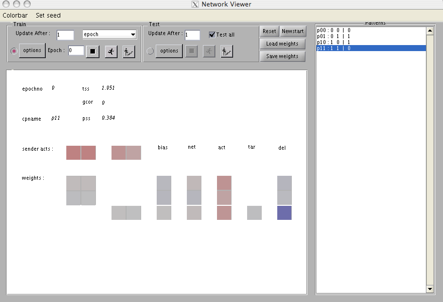 The display area in the network viewer window shows the current epoch number and the total sum of of squares (tss) resulting from testing all four patterns. The next line contains the value of the gcor variable, currently 0 since no error derivatives have yet been calculated. Below that is a line containing the current pattern name and the pattern sum of squares pss associated with this pattern. To the right in the “patterns” panel is the set of input and target patterns for XOR. Back in the main network viewer window, we now turn our attention to the area to the right and below the label “sender acts”. The colored squares in this row shows the activations of units that send their activations forward to other units in the network. The first two are the two input units, and the next two are the two hidden units. Below each set of sender activations are the corresponding projections, first from the input to the hidden units, and below and to the right of that, from the hidden units to the single output unit. The weight in a particular column and row represents the strength of the connection from a particular sender unit indexed by the column to the particular receiver indexed by the row.