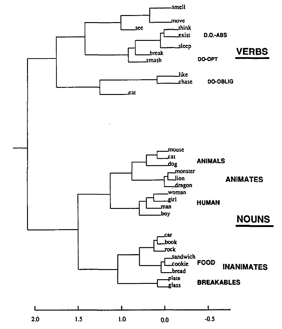 Overall, these three simulations from Elman (1990) show how both segmentation of a stream into larger units and assignment of units into a hierarchical similarity structure can occur, without there actually being any enumerated list of units or explicit assignment to syntactic or semantic categories.
