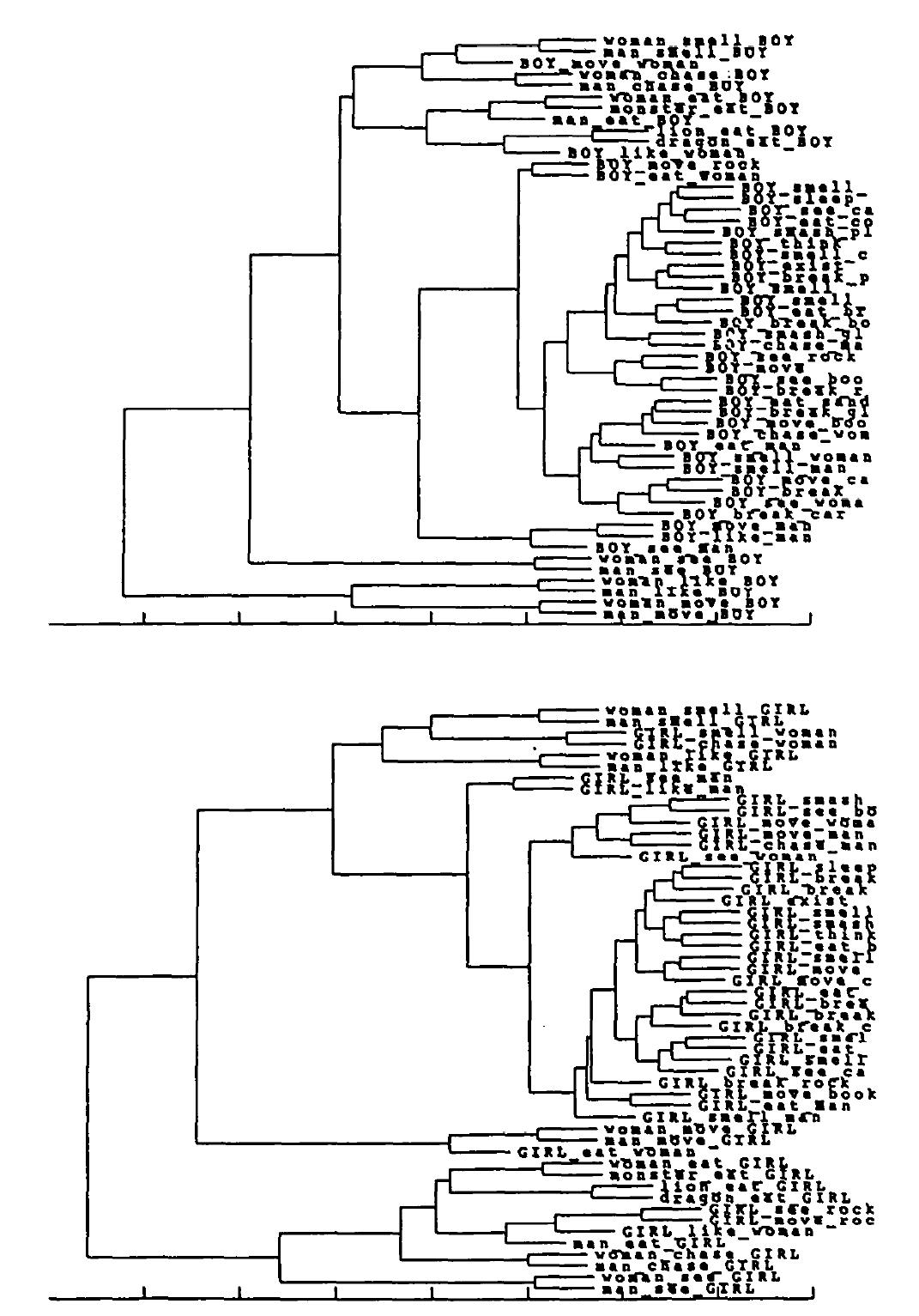 The next two figures illustrate findings from this simulation. The first of these (Figure 7.3) shows a cluster analysis based on the average pattern over the hidden layer assigned to each of the different words in the corpus. What we see is that the learned average internal representations indicate that the network has been able to learn the category structure and even the sub-category structure of the “lexicon” of this simple artificial language. The reason for this is largely that the predictive consequences of each word correspond closely to the syntactic category and sub-category structure of the language. One may note, in fact, that the category structure encompasses distinctions that are usually treated as syntactic (noun or verb, and within verbs, transitive vs intransitive) as well as distinctions that are usually treated as semantic (fragile-object, food item), and at least one distinction that is clearly semantic (animate vs. inanimate) but is also often treated as a syntactically relevant “subcategorization feature” in linguistics. The second figure (Figure 7.4) shows a cluster analysis of the patterns assigned two of the words (BOY and GIRL) in each of many different contexts. The analysis establishes that the overall distinction between BOY and GIRL separates the set of context-sensitive patterns into two highly similar subtrees, indicating that the way context shades the representation of BOY is similar to the way in which it shades the representation of GIRL.