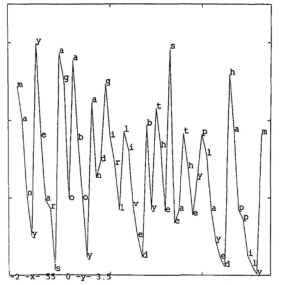 What we see is that the network tends to have relatively high prediction error for the first letter of each word. The error tends to drop throughout the word, and then suddenly to shoot up again at the first letter of the next word. This is not always true – sometimes, afer a few downward steps, there is an uptick within a word, but such uptics generally correspond to places where there might be the end of what we ordinarily call a word. Thus, the network has learned something that corresponds at least in part with our intuitive notion of ‘word’, without building in the concept of word or ever making a categorical decision about the locations of word boundaries.