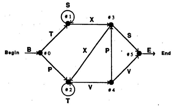 These authors were especially interested in exploring the relationship between SRNs an classical automata, including Finite State Transition Networks, and were also interested in the possibility that SRNs might provide useful models of implicit sequence learning in humans (Cleeremans and McClelland, 1991). Servan-Schreiber et al. (1991) investigated the learning of sequences that could be generated by a simple finite-state transition network grammar of the kind used to generate stimuli used in human implicit learning experiments by Rebur (1976), and illustrated in Figure 7.5. Sequence generation occurs as follows. Each sequence begins with the symbol ‘B’, and enters the state associated with the node in the diagram marked ‘#0’. From there, a random choice is made to follow one of the two links leading out of node 0. After the random choice, the symbol written beside the link is added as the second element of the sequence, and the process transitions to the state at the end of the chosen link. The choice could, for example, be the upper link leaving node 0, producing a T and shifting to node 1. The process iterates as before, choosing one of two links out of the current node, adding the symbol written next to the link as the next element of the seqeuence, and shifting to the node at the end of the link. When node 5 is reached, there is only one remaining possibility; the symbol E is written, and the sequence then ends.