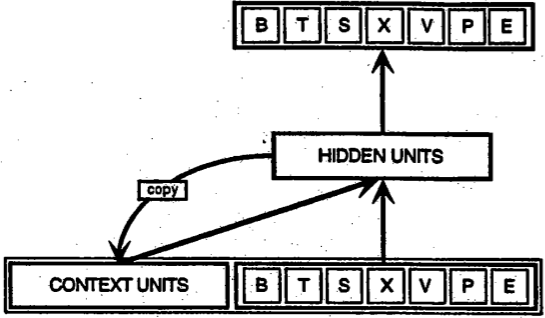 In their simulation of learning sequences generated by the Finite State Transition Network, Servan-Schreiber et al. (1991) assumed that the learner is trained with a series of sequences, which may be generated at random by the sequence-generating finite-state transition network. At the beginning of each sequence, the context representation is reset of a neutral initial state, and the initial element B is presented on the input. The network then tries to predict the next element of the sequence, which then is presented as the target. Small adjustments to the weights are made, and then the process steps forward through the sequence. Now the second element of the sequence (the one after the B) is presented at the the input, and the third item in the sequence becomes the target. The process of propagating activation forward, adjusting the the connections, and stepping forward to the next element continues, until the last element of the sequence (the E symbol) is reached. At that point, processing of the sequence ends. The process then begins again with the next sequence.