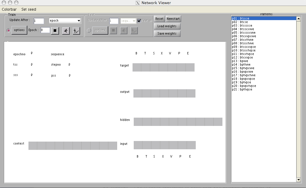 One thing to be clear about at the outset is that the training and testing is organized at the sequence level. Each sequence corresponds to a string that could be generated by the stochastic finite state automaton shown in Figure 7.5. The ptrain option, ‘p’ (which is the one used for this exercise) permutes the order of presentation of sequences but presents the elements of the sequence in its canonical sequential order. Each sequence begins with a B and ends with an E, and consists of a variable number N of elements. As described above, the sequence is broken down into N-1 input-target pairs, the first of which has a B as input and the successor of B in the sequence as its target, and the last of which has the next to last symbol as its input and E as its target. When the B symbol is presented, the context is reset to .5’s. It makes sense to update the display during testing at the pattern level, so that you can step through the patterns within each sequence. During training, update the display at the epoch level or after 10 epochs.