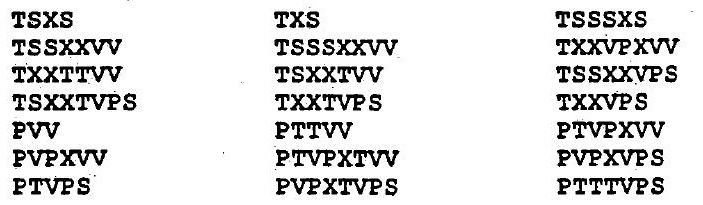 The exercise is to replicate the simulation discussed in Sections 3 and 4 of Servan-Schreiber et al. (1991). The training set you will use is described in more detail in the paper, but is presented here in Figure 7.6. This particular set contains 21 patterns varying in length from 3 to 8 symbols (plus a B at the beginning and an E at the end of each one).