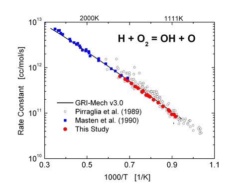 | Arrhenius plot of the reaction rate of H + O2 = OH + O. Excellent agreement is seen with the higher temperature data of Masten et al. and significantly reduced scatter is seen when compared to the work of Pirraglia et al. |