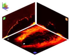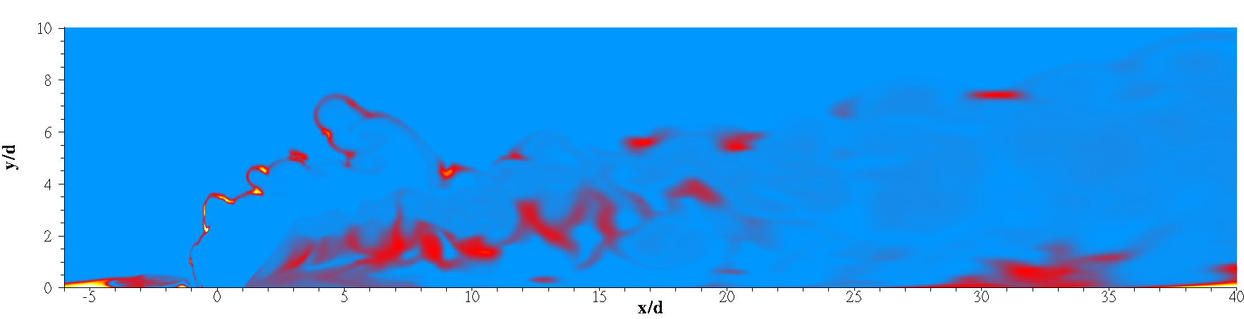 Fig. 1: Instantaneous contour animation of the OH mass fraction in the symmetry plane z=0 at a J=5 from a LES simulation. |