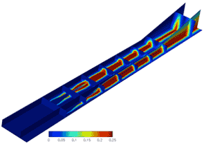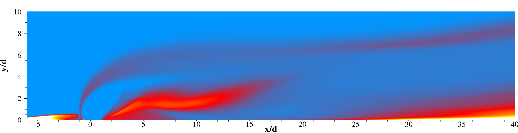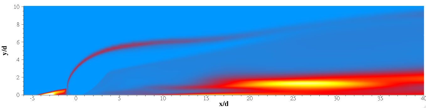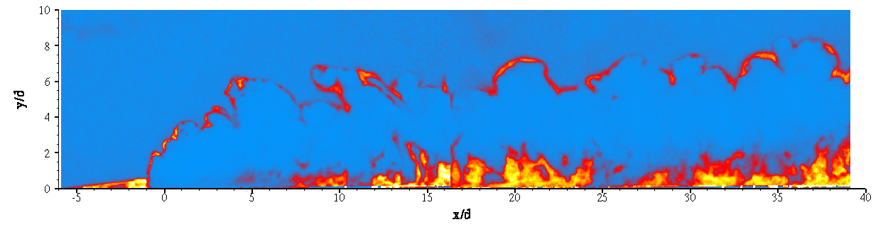 Fig. 2: Instantaneous contour of the OH mass fraction in a plane parallel to the plate at y=0.25d for a J=5 from a LES simulation.