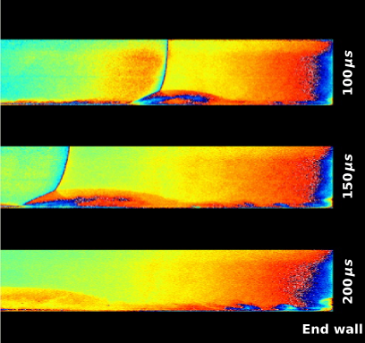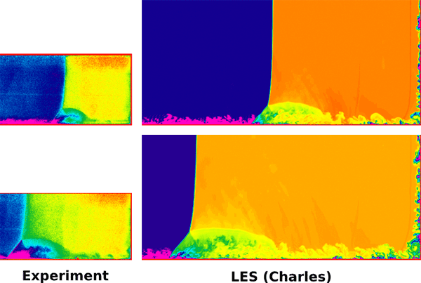| The following composite image shows a comparison of an experimental observation and simulation using the LES code Charles of a reflected shock wave interacting with a turbulent boundary layer in the Stanford imaging shock tube. The gas mixture is such that the reflected shock wave bifurcates as it moves to the left and the interaction of this shock bifurcation and the boundary layer produces a series of disturbances that trail this structure. Two single-shot images at different time delays are shown. |
