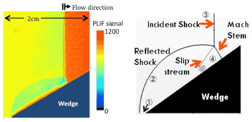 Figure 1. Left: PLIF signal image of an incident shock traveling over a wedge. The single Mach reflection is visible as well as the diffraction effect in the incident shock wave transition when a laser is introduced through the side window. Right: Schematic of a single Mach reflection, adapted from G. Ben-Dor (2007). |