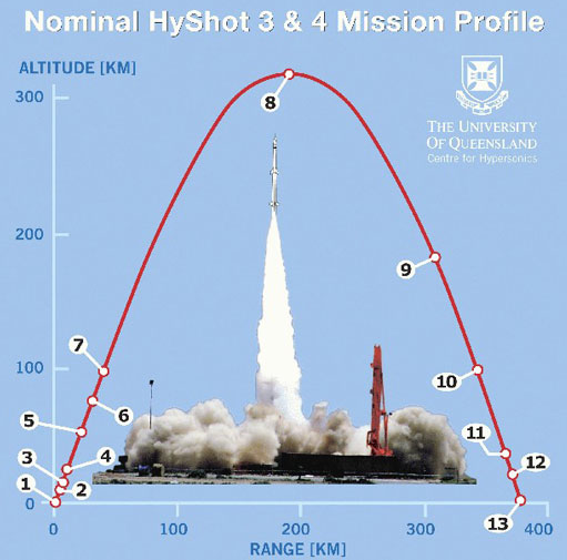 The initial objective is to predict the performance of the Hyshot vehicle flown by the University of Queensland (Australia) in 2004. The flight trajectory is illustrated in the picture below and the simulations will attempt to reproduce the hypersonic flow and engine performance during the last phase of the flight.