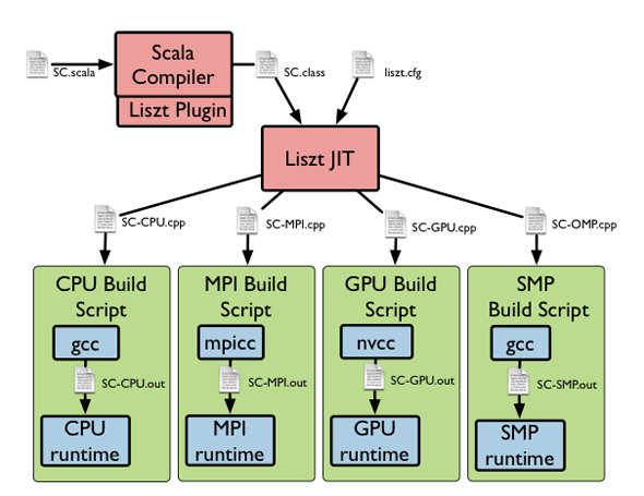 | The Liszt DSL is a domain-specific language for writing mesh-based programs for solving partial differential equations. Liszt code is a proper subset of the syntax and typing rules of the Scala programming language. Currently Liszt programs are written in Scala; a compiler-plugin to the Scala compiler translates the Scala code into an intermediate representation used by the Liszt compiler. |