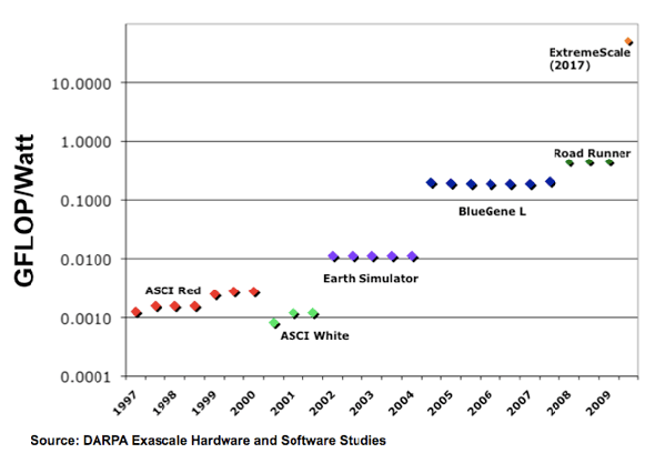 Power efficiency is causing a shift to heterogeneous computer platforms. Future supercomputers will combine features from distributed memory clusters (MPI), Multi-core SMPs (e.g. 32 core, 4-socket systems, Shared memory, Threads/locks, OpenMP), Many-core GPUs (e.g. Fermi, Larrabee, Separate GPU memory, SIMT programming model like CUDA). Examples already exist, including LANL Roadrunner and ORNL Fermi. |