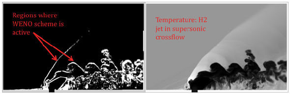 | where 0 <= α <= 1 is a blending parameter. This blending approach is often the basis of implicit approaches to LES, where the blending parameter is selected as a global constant with a value large enough to provide all the necessary dissipation (and potentially quite a bit more). Charles does not use the implicit LES approach -- an explicit sub-grid scale model is used to model the effect of sub-grid scales. To minimize numerical dissipation relative to implicit LES approaches, the value alpha is allowed to vary spatially such that it can be set to zero in regions where the grid quality is good and the scheme based on the central flux is discretely stable and non-dissipative. In regions of less-than-perfect grid quality, however, the central scheme can introduce numerical instabilities that must be prevented from contaminating/destabilizing the solution by locally increasing alpha. The novel aspect of Charles is its algorithm to compute this locally optimal alpha using a preprocessing analysis of the Summation-by-Parts (SBP) properties of the nominally central operators. For shock-capturing, CharLES uses a hybrid Central-WENO scheme. |