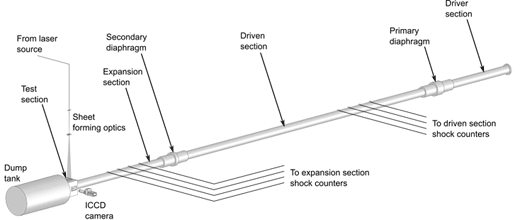 | As shown in the schematic diagram below , the expansion tube is composed of three circular sections 14 cm in (inner) diameter: a driver, a driven and an expansion (or acceleration) sections, respectively. The expansion section terminates into the test section where the test article is placed and which is open onto a vacuum dump tank. The three sections are separated by diaphragm assemblies and are independently pressurized with the gas of interest. The driven section is filled with the test gas of interest (typically air) whereas the driven and expansion sections are filled with low molecular weight gases (typically Helium). |