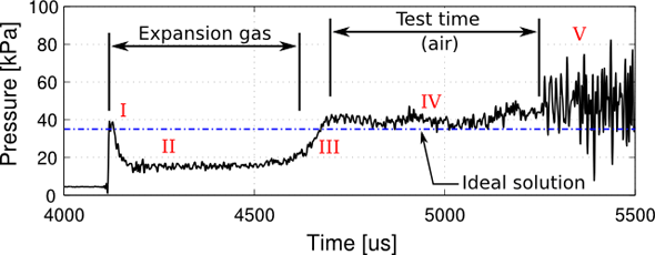 | The operation of an expansion tube is intrinsically an unsteady, short-duration process. To demonstrate the processes occurring in the test section (at the test article location, for example), a time history of the wall pressure variation on a flat plate mounted in the test section at the exit plane of the expansion tube is shown in the figure to the left for a representative test case. The wall pressure was measured with a fast-response pressure transducer embedded in the flat plate. The time axis refers to the initiation of the test and corresponds to the first detection of the primary shock in the driven section. Five relevant events in the evolution of the flow can be identified from the trace. For the particular condition considered in this figure, the expansion gas (Helium) arrives at about 4.1 ms (I) and undergoes an expansion at the exit of the expansion tube into the test section due to a pressure mismatch (II). The contact surface between expansion and test (air) gas arrives at about 4.7 ms (III) and the test gas follows (IV) till an flow disturbance arrives at about 5.25 ms (V) that terminates the test time (defined between III and V). For this particular conditions, the test time is on the order of 0.5 ms. |