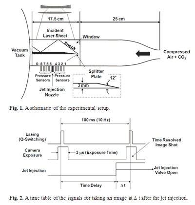 The experimental components for Rayleigh scattering include a Nd:YAG laser (New Wave, Gemini PIV) capable of generating approximately 100 mJ/pulse (532 nm wavelength) energy with 10 Hz pulse repetition, an unintensified CCD camera (La Vision, Imager Intense) and a computer (not shown) to facilitate data acquisition. The laser beam is transformed into a thin sheet of 0.5 mm thickness to illuminate the test section using a combination of two concave cylindrical lenses and a convex spherical lens. Scattered light is captured by the camera along a direction normal to the laser sheet. Laser firing is synchronized with the CCD camera exposure (3 microns shutter), as illustrated in Fig. 2. One of the laser pulses is selected to trigger the jet injection module while the tunnel is operating, but delayed as desired by a pulse delay generator (SRS, DG 535) to take time resolved images at different phases (Dt following the injection of the jet) in the flow evolution induced by the jet injection. The jet injection is controlled by a solenoid valve (ASCO, Red Hat II) driven by a controller (Optimal Engineering System Inc.) receiving the trigger signal from the delay generator. A sonic jet (air, in these studies presented here) is injected into the test section through a 3 mm diameter hole in the bottom wall resulting in a flow disturbance and an overall increase in flow pressure and temperature. Relevant to the jet interaction and mixing with the supersonic free stream is the square root ratio of the jet momentum flux to that of the free stream (R). For our results described here, R is approximately 4.5.