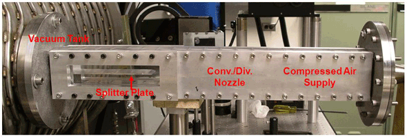 | High pressure air (P0 = 350 kPa and T0 = 300 K) containing CO2 (approximately 25 % by volume) expands through a converging/diverging nozzle (25:1 area ratio) to establish a relatively uniform Ma = 5 flow in a rectangular test section (4 cm × 4 cm cross-sectional area). The exit of the tunnel is connected to a vacuum tank that accommodates the incoming mass flow for approximately 10 seconds of run time (when with a subsidiary dump tank). During this run time, the vacuum tank pressure is maintained at values lower than the static pressure in the test section. A honeycomb of 2.5 cm in length and 3 mm hexagonal cells is placed upstream of the converging nozzle to suppress flow swirling, mostly generated at various junctions in the gas stream inlet piping. The static pressure and temperature of the flow in the test section is approximately 1 kPa and 50 K, respectively. |