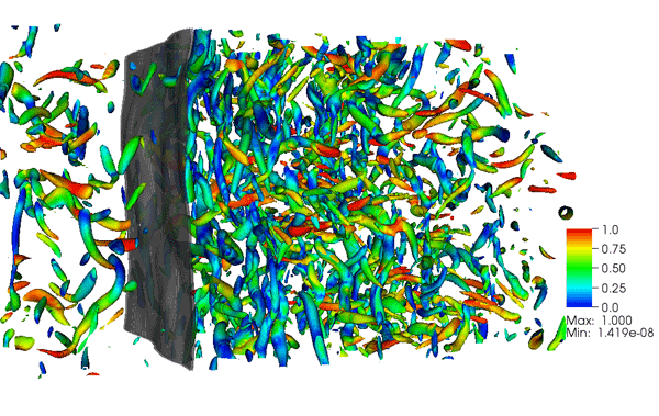 | Within the PSAAP project we are leveraging some results from our SciDAC-2 sponsored sister-project (shocks.stanford.edu). Specifically, we use the datasets from the direct numerical simulations (DNS) of canonical shock/turbulence interaction (produced in the SciDAC-2 project) for model verification and to guide our LES and RANS model development. These unique datasets were created in simulations on up to 65,536 cores on the BG/P machine at Argonne. The figure below shows the essential process in a small sub-domain, with turbulent eddies (worm-like objects, colored by the cosine angle between their orientation and the shock-normal axis) being modified and amplified as they pass the shock (grey sheet-like object). Note the anisotropic orientation of the post-shock eddies. |