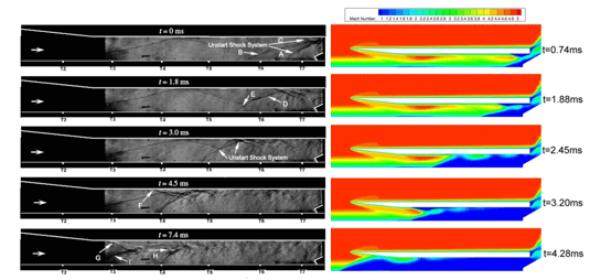 | We are using the unstart experiment from the Clemens-group at UT Austin to validate our RANS computations, specifically how the unstart event progresses upstream through the many shock/boundary layer interaction sites. The unstart is initiated in the experiment by raising a mechanical flap that chokes the inlet/isolator flow; this is emulated in the RANS computations. The figure below shows the progression of the unstart event in the experiment (left) and computation (right). Note the (relatively) slow propagation of the unstart-"wave" towards the upstream. In this work we have also investigated how the domain size and lateral boundary conditions affect the results. |