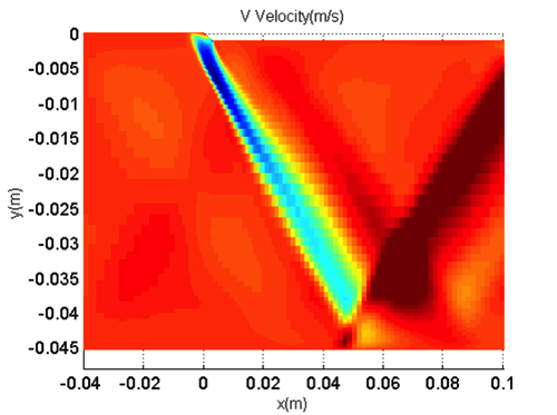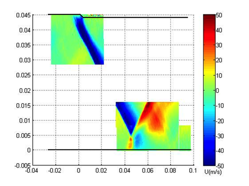 | The first step in the Monte Carlo experiment is to measure the "base case", or the unperturbed case. Both pressure and 2D-PIV data have been acquired. Below is a sample image of the wall-normal component of PIV data - this is a composite image of approximately 25 distinct measurement regions that have been tiled together (with no interpolation or filtering). The velocity change across the shock can be clearly seen, as can the change across the expansion wave. The velocity jump on the bottom wall can also be observed - this is effectively a reflected shock problem. The separation can be seen to be significantly larger than the separation on the top wall. On the bottom wall, the flow can be seen to push up from the wall as it separates (red segment near wall), then drive back toward the wall during reattachment (blue segment near wall). |