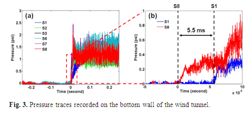 | Tunnel unstart induced by air jet injection is clearly reflected in the pressure traces measured on the bottom surface of the wind tunnel. Figure 3 (a) documents the sudden pressure rise at the various locations on the wall following the jet injection through the nozzle located between S4 and S5. The time reference (t = 0 sec) in this figure corresponds to when the pressure first rises at the sensor located at S8 (i.e., the farthest downstream region characterized). The pressure at S8 starts to rise abruptly at approximately 10 ms after the jet injection trigger signal opens the solenoid valve. Absolute pressure offsets are subtracted from the traces to illustrate relative differences between the pressure recorded before and after the jet injection. The pressure traces recorded at the locations nearest to the jet nozzle (S4 and S5, not shown) fluctuate significantly, due to flow instabilities in the near field of the jet. It is noteworthy that the first pressure increase is recorded at S8 and this high pressure region then expands towards the upstream region of the tunnel, presumably along the subsonic boundary layer, in succession through to the location at S1 (an expanded scale showing only the S8 and S1 traces is shown in Fig. 3 (b)). This ordering in the rise in pressure confirms that choking originates downstream of the jet injection point, triggering tunnel unstart, i.e., a transition to a subsonic flow regime. The propagation of this high pressure region from S8 to S1 (over 12 cm distance) takes approximately 5.5 ms (see Fig. 3 (b)) indicating that that this pressure wave propagates at a speed of approximately 22 m/s. For comparison the freestream speed is approximately 750 m/s. |
