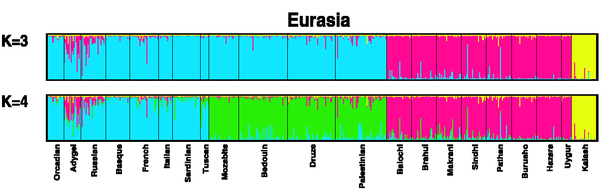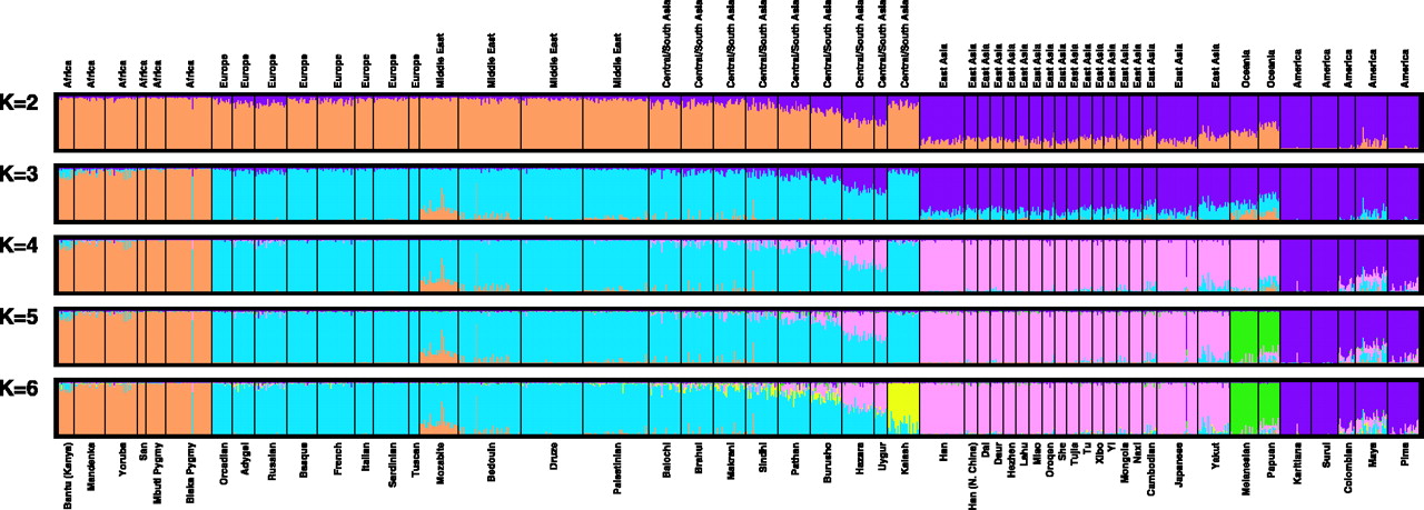 Figura 1. Estructura de la población estimada. Cada individuo esta representado por una linea vertical, la cual esta dividida en los segmentos colorados de K que representan las fracciones estimadas de pertenencia a los grupos K. Las lineas negras separan a los individuos de diferentes poblaciones. Las poblaciones son etiquetadas debajo de la figura, con sus afiliaciones regionales encima. Diez estructuras corren en cada K produciendo coeficientes de membresia individuales individuales casi identidicos, teniendo coeficientes de similaridad sobre 0.97, con excepciones de comparación que involucraqn cuatro carreras en K=3 que separan al Asia Oriental de Eurasia, una carrera en K=6 que separa a los karitianas en vez de los Kalashs. La figura mostrada para un K dado esta basada en la probabilidad de correr en ese K.