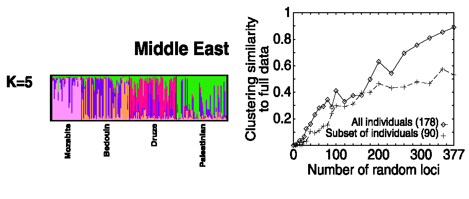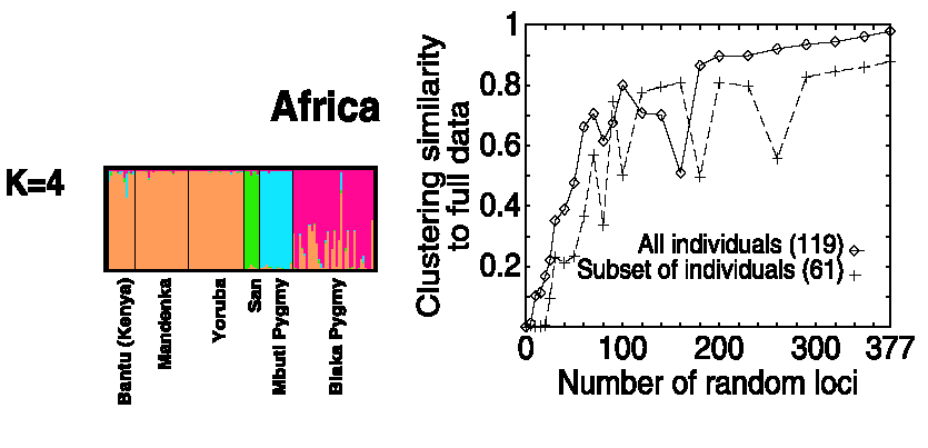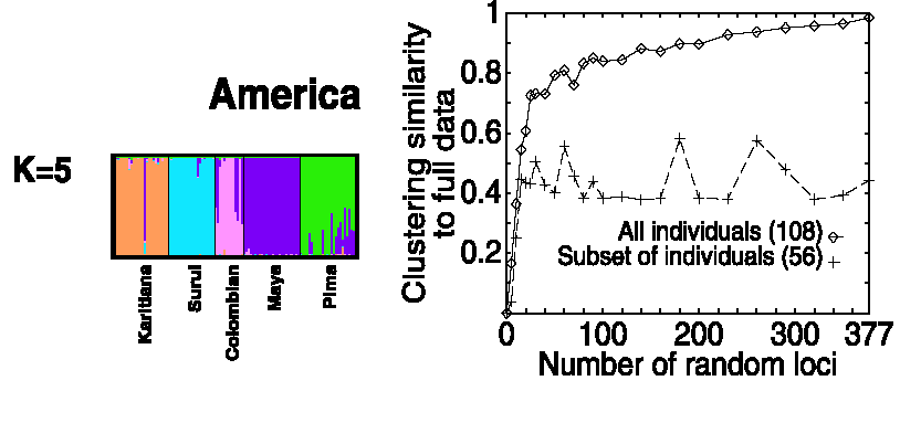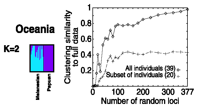 Figura 2. Estructura de población estimada para las regiones. Para America, Oceania, África subsahariana y el Medio Oriente, las soluciones fueron consistentes en las 10 carreras (todos los coeficientes de similaridad sobre 0.97, 0.93, 0.97 y 0.86, respectivamente, excepto aquellos que involucraron una carrera con Africa que asigno a muchos individuos Biaka pertenencia parcial con el grupo San). Los valores de K mostrados para estas muestras son los mas altos, y las mas altas carreras de probabilidad son mostradas tambien. Para las restantes regiones, las soluciones fueron mas variables entre las carreras, y fueron exhibidan las mas altas carreras de probabilidad para varios valores de K. Los graficos de America, Oceania, Medio Oriente y África exhiben coeficientes de similaridad entre las carreras basadas en los datos completos y en subgrupos de datos.