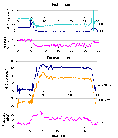 Objectives: We are investigating new methods for individuals at risk for pressure sores (decubitus ulcers) to self-monitor training and routine performance of pressure relief and transfer activities, and to provide a variety of real-time visual, tactile and/or auditory cues to the user when pressure or inactivity limits have been exceeded. The simplest means for prevention of skin breakdown is periodically redistributing body weight, but poor compliance with self-performed or assisted weight relief or turning in bed can still lead to skin lesions. Methods: We have designed a Wearable Accelerometric Motion Analysis System ("WAMAS") consisting of 3-axis motion sensors, in this case placed on a belt above each hip, along with a self-contained data acquisition computer. Flat pressure-sensing balloons were added, located under the body at a distance from probable sites of skin breakdown (e.g.: mid-thigh). Five chronic spinal cord injury subjects were asked to perform repeated weight relief (arm push-up, forward, oblique and lateral lean) activities on two occasions. Results/Conclusions: Interface pressure and body motion data were analyzed to extract characteristics identifying correct and incorrect weight shift activities. Uniaxial accelerations were converted to lateral ("AZY") and forward ("AZX") waist tilt angles; change in 3-second rolling standard deviation was used to detect start of an activity. Activities were distinguished by Boolean sum of angle, pressure, and time after start relative to pre-start: {DAn<>an AND DPn <> bn AND t <> tn ANDNOT DAm<> am ANDNOT DPm <> bm}, where a, b, and t are threshold values of n variables which must cross thresholds and m variables which must not pass thresholds. In the examples shown, correctly-performed right lean requires right (RB) and left (LB) AZY to decrease at least -10° while left pressure decreases at least -5 mm Hg for t >15 seconds. Forward lean requires RB and LB AZX angles and thigh pressure all to increase bilaterally.