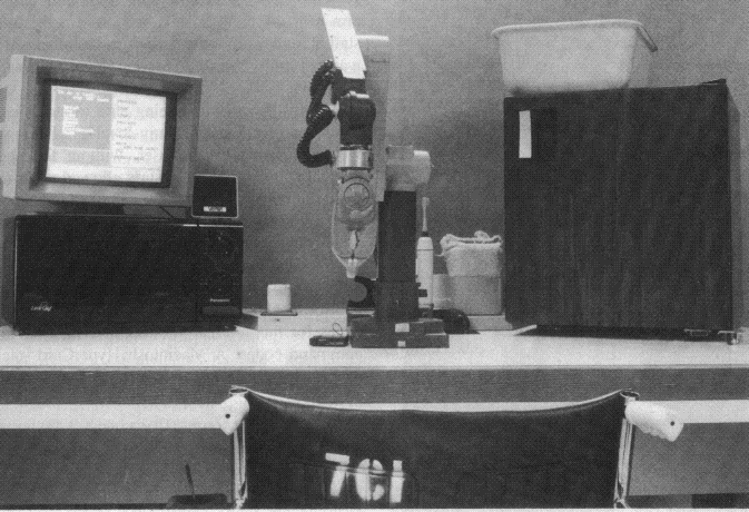 Clinical Robotics Laboratory (CRL): 1985-1989.OverviewBased on the lessons learned from the Robotic Aid Project and its 8-bit technology, one of the two spawned projects involved a complete technology modernization of the desktop concept [13]. [The other project focused on mobile robotics and is discussed in the next section.] The Clinical Robotics Laboratory (CRL) was established in the VA Spinal Cord Injury Center (SCIC) for development and evaluation of a new generation of desktop robots to assist people in performing Activities of Daily Living (ADLs). In the CRL, a newer generation of the same robot was used, the PUMA-260 (see Figure 1). Improved software and mechanics made this robot more robust. The 8-bit Z-80 based controller was replaced by an IBM-PC/XT (upgraded to 80286 and then 80386 microprocessors as these became available). The original speech I/O system was replaced by a succession of units, and finally by the VOTAN VPC-2100 card. Visual user feedback was presented on an EGA screen in functionally-distinct windows [9].