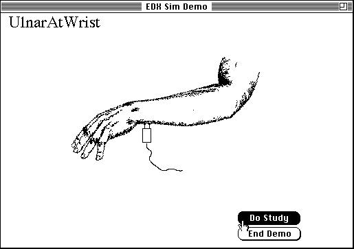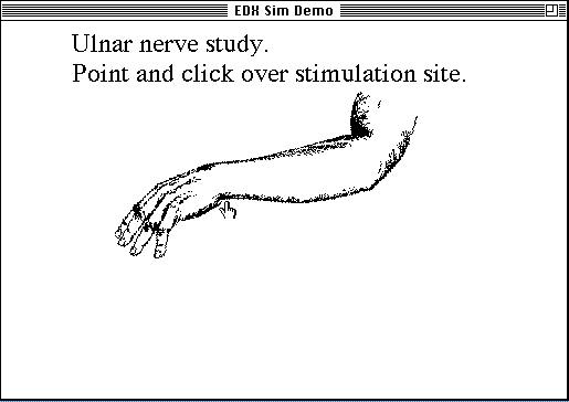 Status - Selection of the desired simulation site (wrist, below elbow, or above elbow) determines the set of possible evoked responses (Figure 1). Feasibility of the approach has been documented by creating a sample case study which demonstrates the NCS findings characteristic of an ulnar nerve injury in the region of the elbow (Figure 2). Measurements of waveform latency, amplitude, nerve conduction velocity, etc., are then performed using standard clinical neurophysiological techniques.