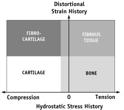 Combining concepts developed by F. Pauwels fifty years ago with results of recent in vitro studies regarding mechanical control of various important cellular processes, we hypothesize that loads which cause compressive hydrostatic stress in the tissue will stimulate the net production of cartilaginous matrix constituents, while loads which cause significant distortional (octahedral shear) strain in the tissue stimulate the net production of fibrous matrix constituents. In the case of differentiating pleuripotential tissue, we hypothesize that low distortional strain and low hydrostatic stress permit the direct formation of bone, as in primary fracture healing. These concepts can be graphically represented (Figure 1).