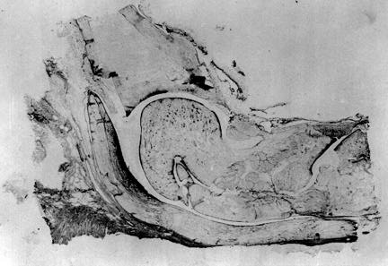 Figure 2a. The rabbit FDL tendon wraps around the talus. Cartilaginous tissue stains darkly (Alcan Blue stain).