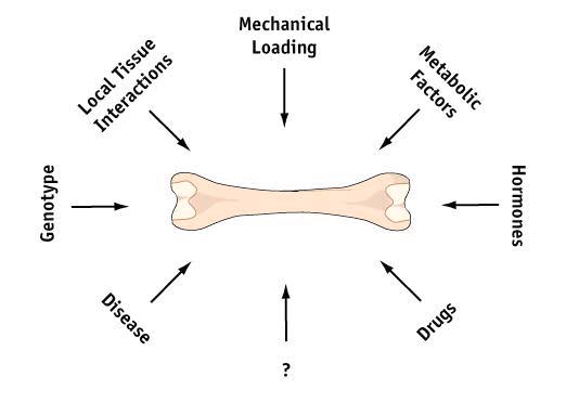 Skeletal development, growth, maintenance and aging are driven by both genetic and epigenetic factors, such as mechanical stimuli, hormones, growth factors and metabolic status (Figure 1). The relative importance of these factors is poorly understood but they have an obvious impact on the pathogenesis and progression of osteoporosis, osteoarthrosis and fracture, and are responsible for an ever-increasing cost to society. An understanding of these skeletal processes will facilitate development of treatment strategies and suggest possible prophylaxis.