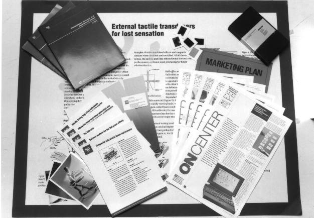 Presentation materials - To support the presentation of research and development findings by investigators at technical conferences the TT staff maintains a graphic, photographic and video capability that complements that of the on-station Medical Media Service. Working closely with investigators, The TT staff provides both a creative and a technical resource for the design and production of presentation materials, including photographic and computer generated slides, technical poster design and preparation, video data collection and reporting, conference exhibits, and product data sheets. The TT staff designs and produces the Center's exhibit booth for RESNA, the annual rehab engineering conference. In May 1993 the TT section developed papers, posters and presentation materials for a Center open house and building dedication.