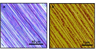 | (a) Polarized microscope image and (b) phase mode AFM image of directionally crystallized P3HT. |