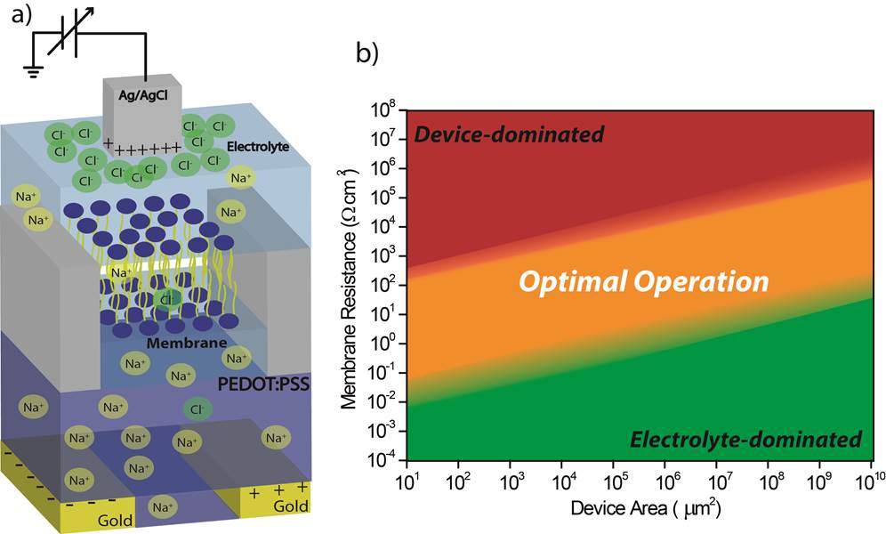 | (a) Schematic of a barrier layer-functionalized OECT and (b) plot of the membrane resistance as a