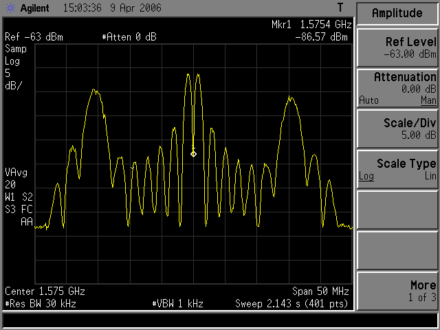 Verification of the code and code generator derived from the SGMS, data was collected using the 150 ft (45.7 m) parabolic reflector dish antenna (“Stanford Dish”). It is located on Stanford University Radio Science field and operated by SRI International. Again the Agilent 89600 Vector Signal Analyzer was used for the data collection. The signal received by the dish is about 600 times stronger (28 dB) than the signal received by the SGMS. The result is that we should have almost no bit errors when we demodulate the code.