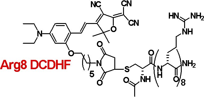 Single Molecule Motions of Oligoarginine Transporter Conjugates on the Plasma Membrane of CHO Cells This work explores the interaction of polyarginine cell-penetrating peptides with the plasma membrane of CHO cells. SM tracking and diffusion analysis are enabled by the use of one of our new DCDHF fluorophores. (Ref: JACS (2008)) |