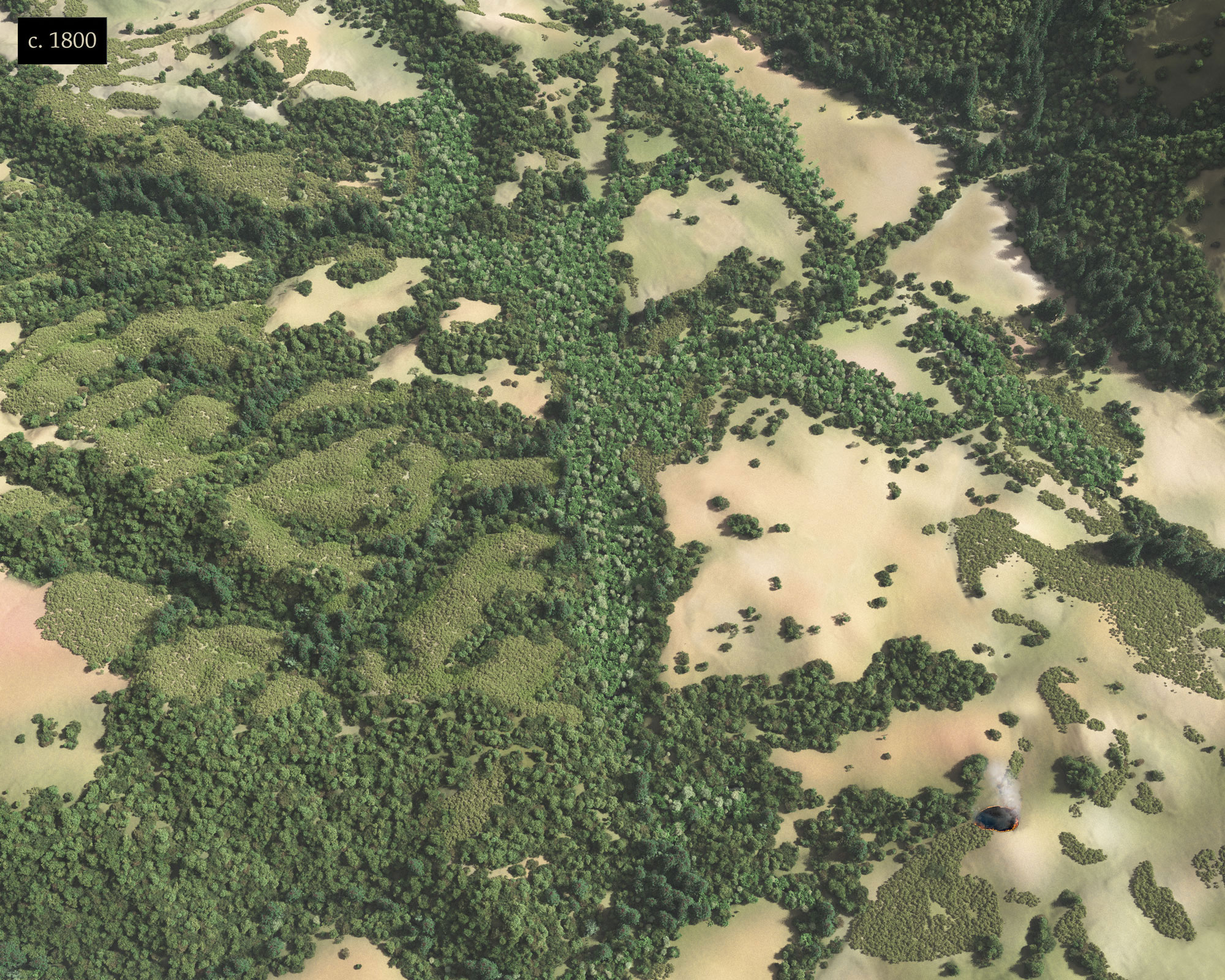 Weighted suitability surfaces were calculated and compared by balancing the relative importance of factors such as climate and land-use practices. Each result was then evaluated against our historical assumptions and knowledge of the local ecology, and improved iteratively until the final map met both the “rules” for environmental conditions and the historical assumptions developed by the experts. The final result was a possible four separate layers for each vegetation class (extent, size, color and density). Micro adjustments to vegetation extents and densities were made manually to improve the reliability in some areas, remove unintentional artifacts, and ease transitions between vegetation classes.