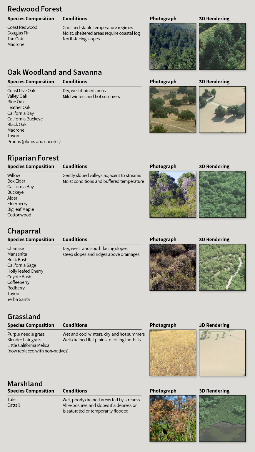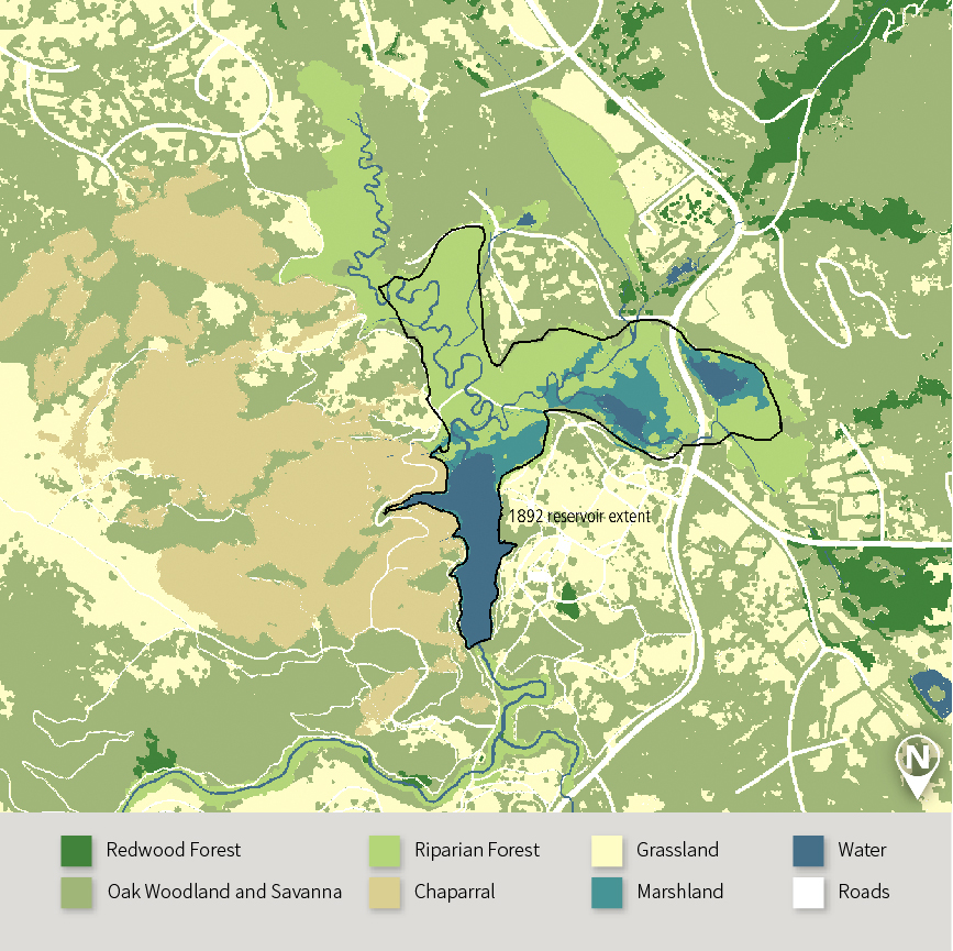 Our analysis focused on describing the historical hydrologic and topographic conditions and the extent, size, and density of six major vegetation types (redwood forest, oak woodland and savannah, riparian forest, grassland, chaparral and marshland) common in the Santa Cruz Mountains. While we have detailed survey data prior to the dam construction that describes the hydrology and topography of the study area, our knowledge of vegetation is mostly based on written accounts and is spatially imprecise.