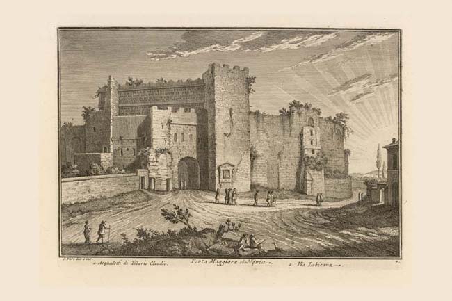 A dramatic rising sun reveals Rome's largest city gate: the monumental Porta Maggiore. Since the gate looks very different today with its two open arches, the best way to understand this Vasi view is to compare it to the Nolli plan of the site. The emperor Aurelian (270-75 AD) used a section of the Claudian aqueduct (1) (visible as the taller element in this print) for this part of his city walls, filling in all its arches except for the two spanning Via Labicana (2) and Via Prenestina, two ancient roads which converged just beyond this point. These arches became a double gate in the walls. Honorius (395-423 AD) reduced this to a single gate by blocking the southern arch with a wall anchored on the tomb of Eurisace and building a new arch spanning from the tomb to the aqueduct). The tomb is identifiable on the print as the masonry mass with two short columns at its corners. Pope Gregory XVI (1831-46) had the Honorian accretions removed during his restoration of Porta Maggiore. Near the corner of the wall on the right and meeting it perpendicularly, we see the stacked aqueduct Marcia-Tepula-Julia in cross-section. The lower opening is the rectangular duct of the Acqua Marcia, built in 144 BC. Above it is the Acqua Tepula (125 BC) and the Acqua Julia (33 BC) started by Julius Caesar. To the right of the aqueduct is a sign reading DRITTO A S. LORENZO (straight to St. Lawrence) which seems to refer to the road curving away to the right, leading to Porta S. Lorenzo, Plate 6. Just to right of center at the bottom of the print Vasi appears to be sketching this view while drawing the attention of a curious bystander and an inquisitive canine.