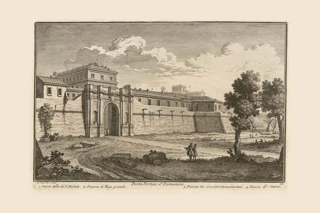 Porta Portese is the only instance where the later and earlier name for a gate correspond, the former being a corruption of the latter. But the placement of the two gates differs because the ancient one stood 453 meters further out on the Via Portuensis as is to be seen on the Nolli map which shows the lost section of the Aurelian walls in Trastevere (light grey, indicating Nolli's reconstruction). Vasi was aware of this difference because he devotes half of Plate 11A to his own reconstruction of the ancient gate which he labels: Esterno della Porta Portese antica deruta da Urbano VIII l'an. 1643 (exterior of the ancient Porta Portese destroyed by Urban VIII in 1643). This print depicts the new gate in the Baroque walls which were built under the same Pope. The gate was completed by Urban's successor Innocent X (1644-55) whose coat of arms appears above the arch. Like the considerably earlier Porta S. Spirito, Plate 15, the triumphal arch motif is the main element of the design by M.A. De Rossi. All the buildings which Vasi numbers on the print can be identified on the Nolli map: Ospizio delle donne in S. Michele (1), next to the Port of Ripa Grande; Dogana di Ripa Grande (2), customs house demolished in 1914; S. Maria del Priorato (3), Priory of the Knights of Malta, on the Aventine hill. The position of the river is signaled by the masts and sails of two boats (4) at far right which also are an indication of the nearby port of Ripa Grande, Plate 97 and Plate 98.