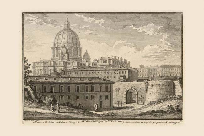 Porta Cavalleggieri was demolished in the late 19th century, though the massive round tower (or Torrione) to the right of it survives, and the stones of the arch have been set into the wall to the left of the wide opening which has replaced the gate. The gate as it appears in Vasi was rebuilt by Alexander VI (1492-1503) whose coat of arms is still visible above the reconstructed arch. The sarcophagus fountain with its inscription seen to the right of the gate has now been moved to the left of this same arch. The gate was originally named after the tower: Porta del Torrione, but changed name under Pius IV (1559-65) who established the light horse (Cavalleggieri) barracks and stables (4) near it. The same barracks also appear in Plate 17. The dramatic view of St. Peter's dome (1) is still obtainable from this view point, unimpeded by the lengthened nave of the basilica as it appears in other views (see for example Plate 114). A rebuilt version of the Sant'Ofizio (3), headquarters of the Inquisition, still survives, while the Pontifical Palace (2) remains virtually unchanged. A seductive figure in the left foreground beckons to a passerby providing a worldly contrast to the lofty dome of St. Peter's looming directly above.