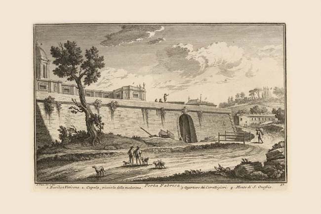 The Porta Fabrica was the service entrance to the Vatican area, provided especially for the building materials needed for the construction of St. Peter's Basilica. Indeed the "Fabbrica di S. Pietro" (fabbricare meaning to build) refers to the specific institution responsible for that lengthy endeavor which lasted for most of the 16th and 17th centuries. The gate was formerly known as Porta delle Fornaci (Falda in his 1676 map labels it Porta Fabrica delle Fornaci) because of the adjacent Valle delle Fornaci where numerous fornaci (brickyards and kilns). Nolli identifies no less than five fornaci within 100 meters of the gate. One of these, the Fornace Riccardi, appears at the right edge of the print. Behind it is the Janiculum hill which Vasi labels Monte di S. Onofrio (4) upon which a section of the city walls is discernible. The flank of St. Peter's (1) and one of the small domes (2) is visible behind the wall, as well as the roof of the Cavalleggieri barracks (3); see Plate 16. Today the gate is still in place but bricked up and half buried due to the raising of the street level in the early 20th century. The coat of arms of Clement XI (1700-21), identifiable on the print, is still in place above the sealed gate. Below the arms is another marble tablet with two vertical keys and the letters F A signifying Fabbrica Apostolica.