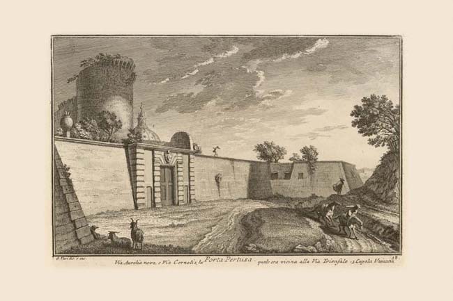 The Medici coat of arms over Porta Pertusa reveals that it was built by Pius IV (1559-65). The same Pope built this whole section of the bastioned walls around the Vatican hill which replaced the mid-15th century walls built by Nicholas V (1447-55). The two streets in the print which Vasi refers to as Via Aurelia nova and Via Cornelia, pass along its flank. The tall round tower visible behind the wall is the high point of the latter. The old Porta Pertusa, in Nicholas V's wall, was located further north as revealed by the 1551 Bufalini map. Nolli shows both walls and the gate clearly. The gate was sealed in the 17th century, but Nolli shows it as being open again. So does the 1842 Census map of the city. One or both of these maps may have misled the French in believing that the gate was open, resulting in their failed attempt to penetrate the city at this point in1849. Instead they found the gate sealed as we see it today. Vasi shows the dome of St. Peter's (1) rising above the wall, though it is not actually visible from this viewpoint as the contemporary photograph makes clear.
