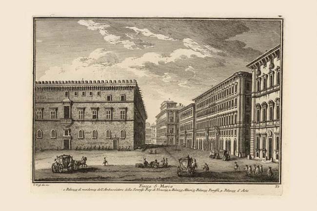 This print might better have been entitled "Via del Gesù", the street alongside Palazzo Venezia (left), and shown disappearing into the distance. The street was renamed Via del Plebiscito in the late 19th century to commemorate the 1871 plebiscite on the unification of Italy. Only part of the square which Vasi calls "Piazza S. Marco" and Nolli names "Piazza di Venezia" (NN 906) is visible in this print. The rest of it and of the palazzo Venezia can be seen in a companion print, Plate 66. Palazzo Venezia (1) was started in 1455 by Cardinal Pietro, as a residence built around the Venetian national church of S. Marco. It was completed by his nephew after Pietro was elected Pope Paul II. The building became the Venetian embassy after 1564. The balcony of the piano nobile was made famous by Mussolini who used it to address the crowds during the Fascist period. Vasi seems particularly interested in the row of palaces lining Via del Gesù on the right. The mid-17th century Palazzo d'Aste (4) in the right foreground appears again in another print showing its position at the beginning of Via del Corso, Plate 170. Next in line is the enormous Palazzo Pamphilj (3) which has two other major facades, one on Piazza del Collegio Romano, Plate 66, and the other on Via del Corso, Plate 44. This one is the latest of the three facades, built in the 1740s by the Roman architect Paolo Ameli. Vasi does not number the next palazzo named Gottifredi (NN 857). It was built in the 17th century and completely remodeled in the mid 19th century by the Grazioli family who still own it. The Via del Gesù narrows where the corner of Palazzo Altieri (2) protrudes into it. A better view of this 17th century palace appears in another Vasi print, Plate 79.