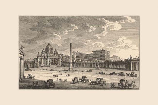 What at first appears to be a postcard shot is actually an all-encompassing view of the Vatican area as seen in morning light, presciently including much of what would become the sovereign state of Vatican City after 1870. This print relates closely to Vasi’s lateral view of the piazza, Plate 27. The great sweep of the Bernini colonnades (2) (1650s) encompassing the piazza is called "Anfiteatro" by Vasi, possibly alluding to the fact that the Colosseum would fit almost exactly within that oval. The right hand fountain, which bears the coat of arms of Paul V Borghese (1605-21), was moved to its present location by Bernini, while the symmetrical fountain was built ex novo during the reign of Innocent XI Odescalchi (1676-89). Maderno's early 17th century facade for St. Peter's lacks the two intended corner towers which would have framed Michelangelo's dome (completed by Della Porta in 1593). The ancient obelisk was moved to this site from its original location on the south side of St. Peter's. It was placed in the piazza slightly off the axis of the church by Domenico Fontana during the reign of Sixtus V (1585-90) and became the center point for the development of Bernini's design for the oval piazza. Sixtus V also ordered the building of the boxy papal residence to the right of the open, porticoed courtyard of S. Damaso (1). To the right of this block is one of the two long wings, built by Bramante in the early 16th century, joining the papal palace to the distant Belvedere building erected by Innocent VIII (1484-92). Visible on the skyline between the St. Peter's facade and the obelisk is the sloping roof of the Sistine chapel (1473) built during the reign of Sixtus IV (1471-1484). This is one of Vasi’s most photographically realistic views which also accurately captures morning lighting effects. This can be verified by comparing it to the contemporary photo. Only the left hand corner of the colonnade, which is shown to be smaller than it is from this station point, and the vertically exaggerated dome of St. Peter’s depart from the veracity of the scene.