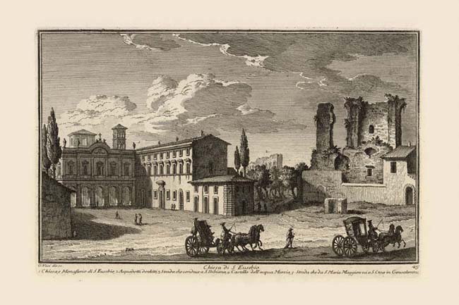 In this view Vasi seems to be at least as interested in ancient remains as in the church of S. Eusebio (1). The distant arches of the ruined Acqua Julia (2) are shown approaching the terminal display, or mostra (4), of that aqueduct on the right. Vasi's identification of this as "Castello dell'acqua Marzia" relates it to the wrong aqueduct and mistakes this former water fountain for a castellum (cistern). Nolli supplies the then current name: Trofei di Mario, referring to statue groups which once stood in the two ruined arches visible in the upper part of the structure, but by this time no longer there, having been moved to the Campidoglio to adorn the balustrade of that piazza. Except for the medieval bell tower, the church and convent of S. Eusebio appear in 18th century guise. Vasi points out two streets which affect this site: the vanished Via di S. Bibiana (3) passing between the monastery and the ruins, led to the church of the same name (NN 27), and the street which the carriages are following, Via di S. Croce in Gerusalemme (5) leading to the church which appears in Plate 47 (NN 21). The low building at the left edge of the print does not appear on the Nolli map.