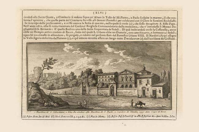 The 4th century church of S. Sebastiano (1) is located on the Via Appia Antica about 2.5 kilometers (1.6 miles) from Porta S. Sebastiano, Plate 10. It is built over a set of Early Christian catacombs in which the saint was buried. The facade was designed by Ponzio but completed by Vasanzio in 1615. S. Sebastiano is one of the Sette Chiese (Seven Churches) to be visited by all pious pilgrims coming to Rome. In the formal procession which visited the Seven Churches it was next in sequence after S. Paolo fuori le Mura, Plate 100, from which it was reached by the Via delle Sette Chiese (2) which is shown entering Via Appia at the right edge of the print. Further out on the Via Appia, at far left we see the ancient cylindrical Tomb of Cecilia Metella (3). In the first years of the 14th century, the Caetani family turned it into a fortress anchoring a rectangular walled stronghold known as Capo di Bove. Via Appia passed into this fortified perimeter through the gate (now demolished) visible to the right of the tomb.